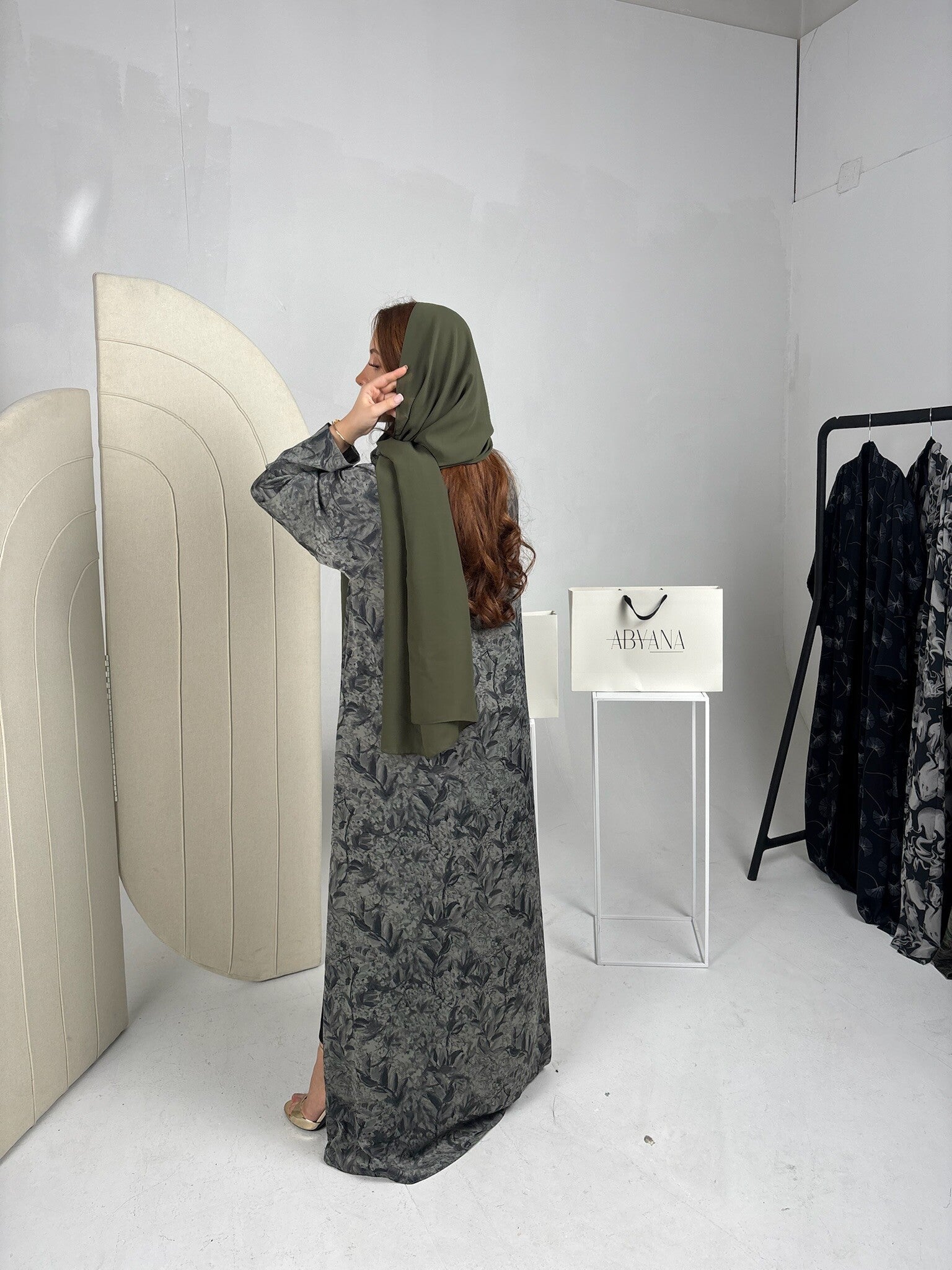 The Pebble Green Abaya stands out with its muted green tone inspired by natural stone surfaces. The fabric falls smoothly, offering a structured yet gentle look. It’s a refined piece that blends simplicity with presence — ideal for a polished daily style.